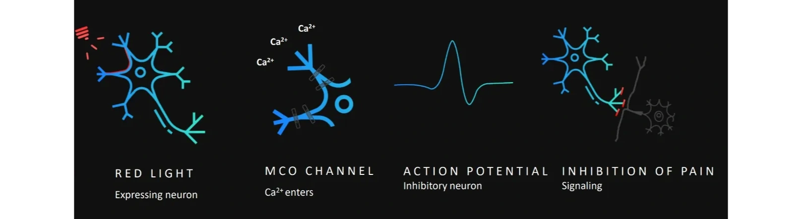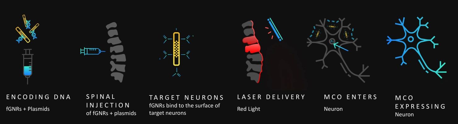 The therapy works by turning pain-blocking neurons in the spine into photoreceptors – like in your eyes – so they can be activated with a simple LED light. The light sensitive proteins are delivered to the neurons using functionalized gold nanorods and low power laser light with a promotor so they are only activated in those neurons that can block pain.
